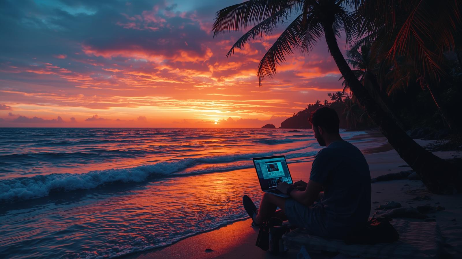 The Instagram feed tells a compelling story: a laptop resting on a sun-drenched beach towel, a vibrant cocktail next to